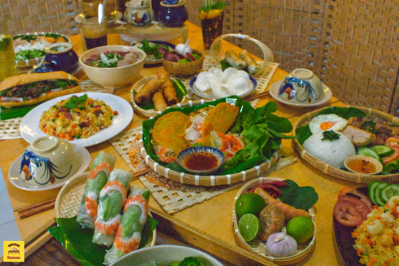 Crispy rice flour pancakes, served with fresh herbs, bean sprouts and fish sauce.