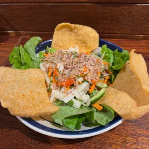 Squid, prawns, crunchy lotus root, pickled vegetables and herbs – tossed in chilli fish sauce dressing, served with crackers.